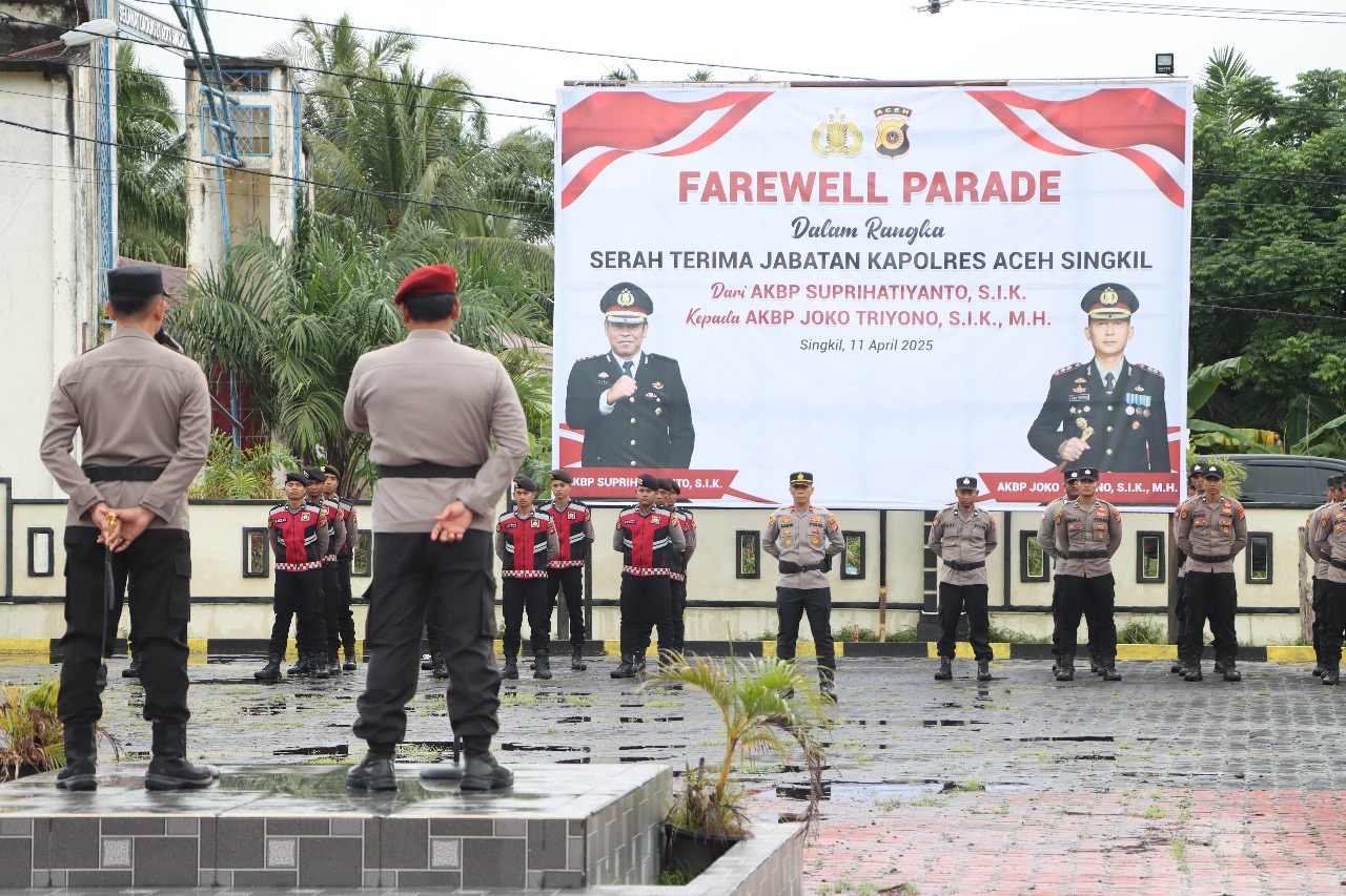Singkil – Polres Aceh Singkil menggelar acara Pisah Sambut Kapolres dari Pejabat lama AKBP Suprihatiyanto, S.I.K. digantikan oleh Pejabat baru yakni AKBP Joko Triyono, S.I.K., M.H., yang berlangsung di Mapolres Aceh Singkil. Jumat, 11 April 2025.
